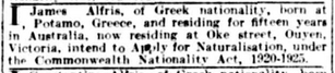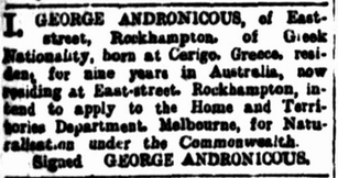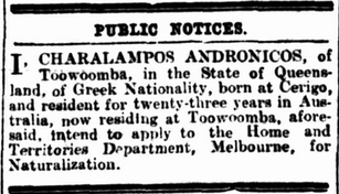 Part of the Australian naturalisation process from about 1918 was for the applicant to place two advertisements in Australian newspapers stating their intentions. Old Australian newspapers are available online through the National Library of Australia's website called Trove. These have been digitally scanned and indexed. Incorrect digitising as well as unusual ways of spelling Kytherian place names or even just an incorrect print can make these announcements very difficult or impossible to find.